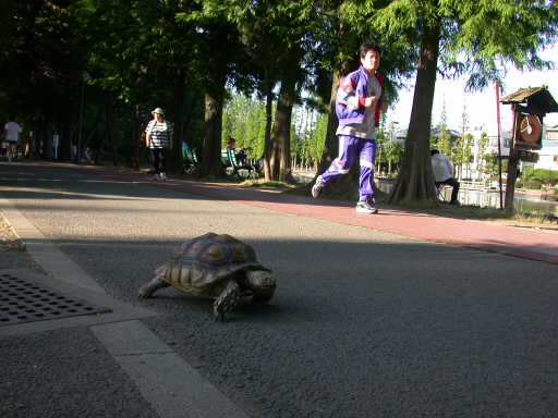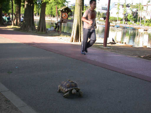 | 亀も つられてJogging。 別所沼公園。 2002.6.9 |