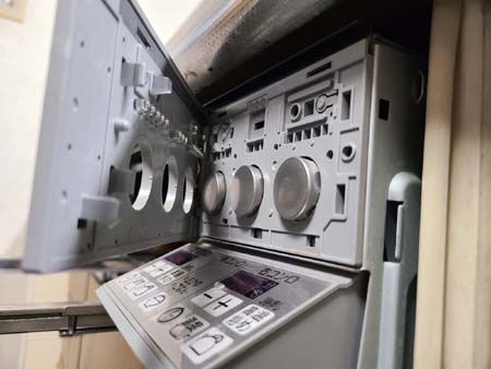 右側のコンロ操作部(上段の化粧パネルを外す)